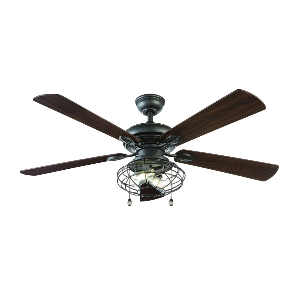 The Home Decorators Collection Ellard 52 in Natural Iron Ceiling fan has a unique cage light kit and included 7 Watt edison style LED bulbs for energy efficiency Also can be installed with either distressed gray or walnut blades to coordinate with your furniture of floors The quick install blade system allows for faster installation